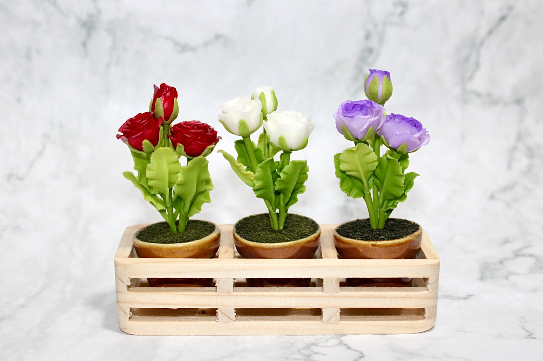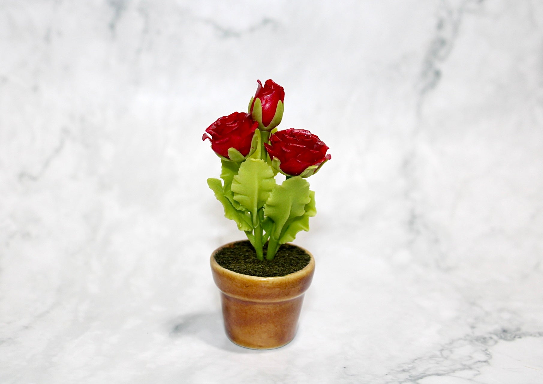 Single Miniature Roses. Handmade with polymer clay placed in ceramic pot.